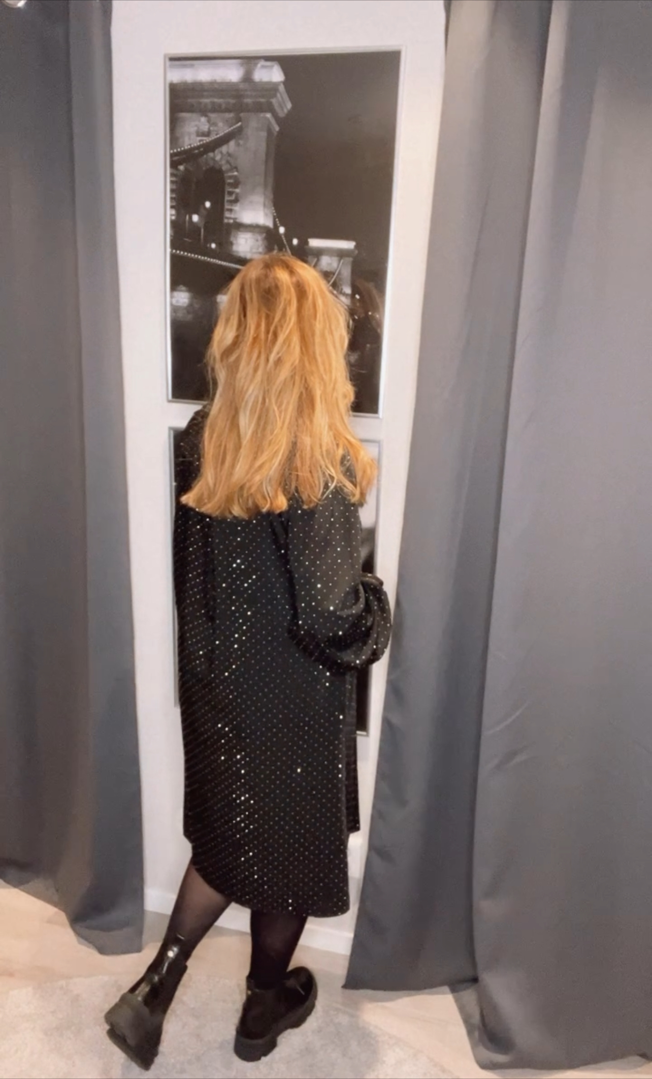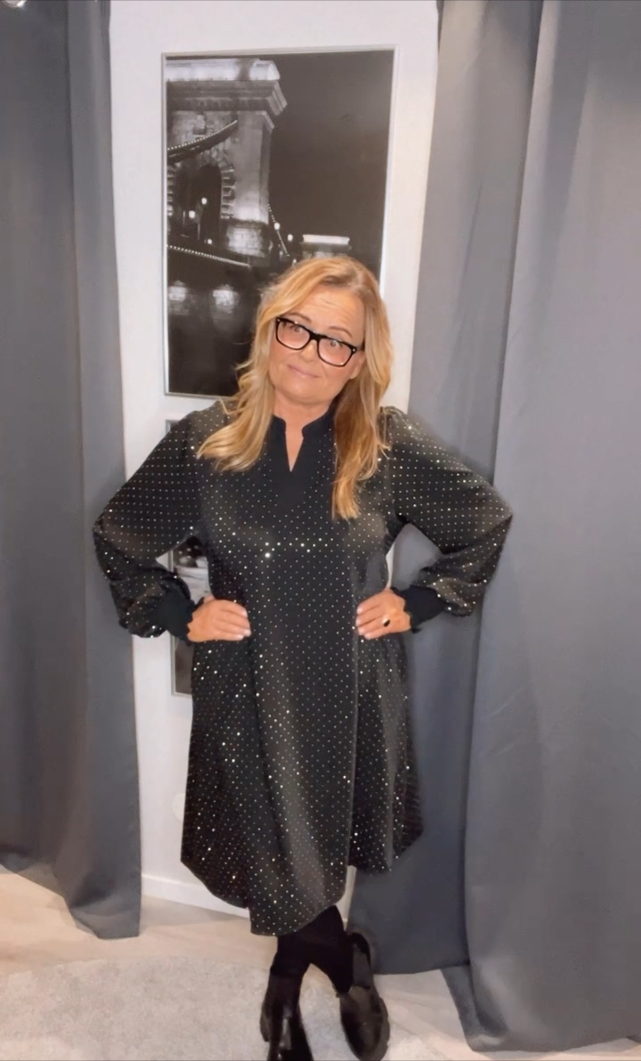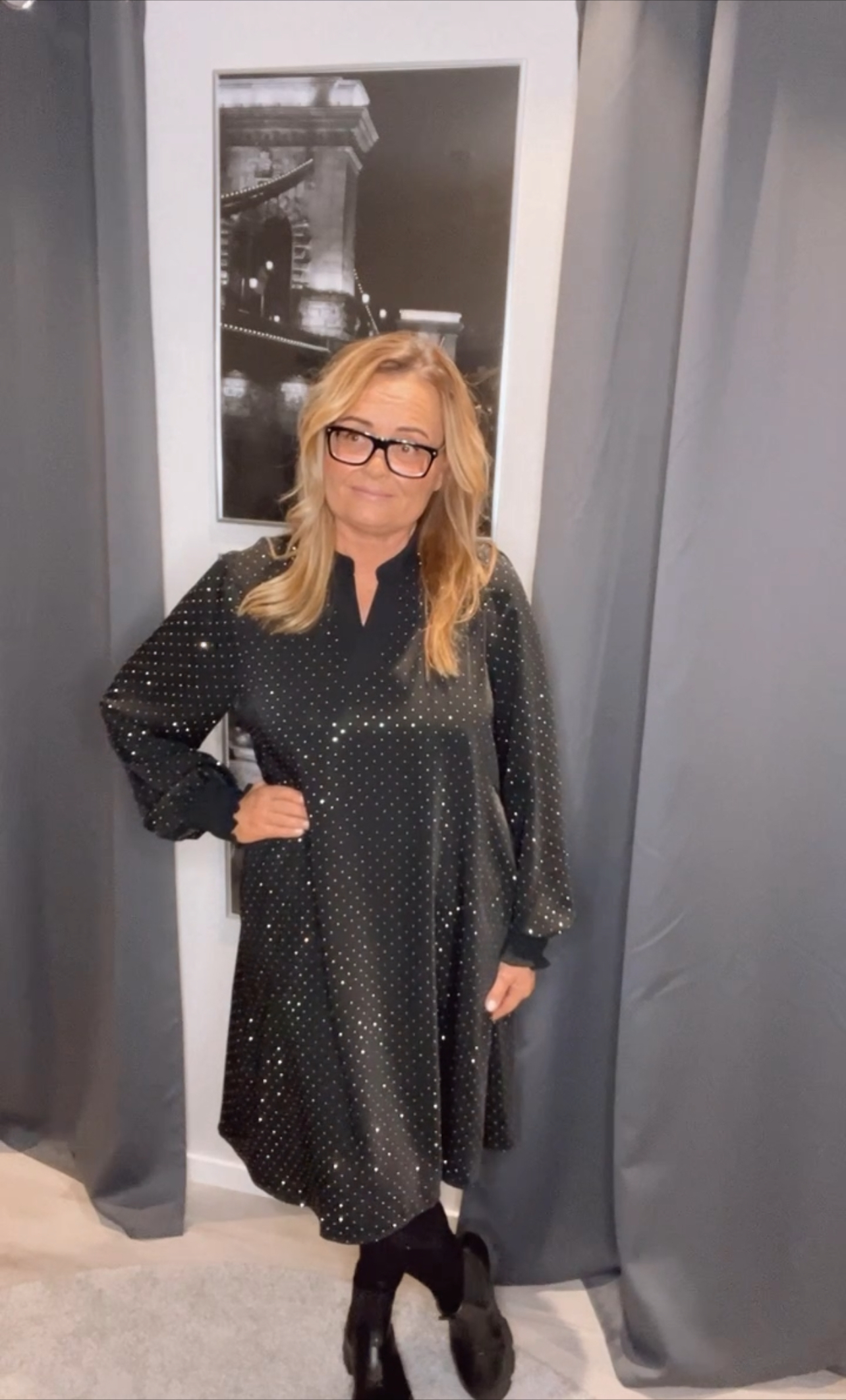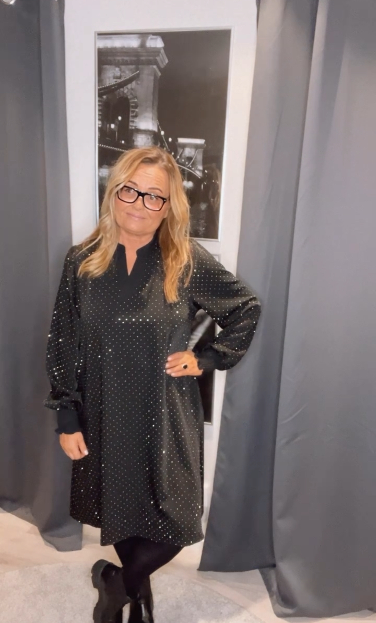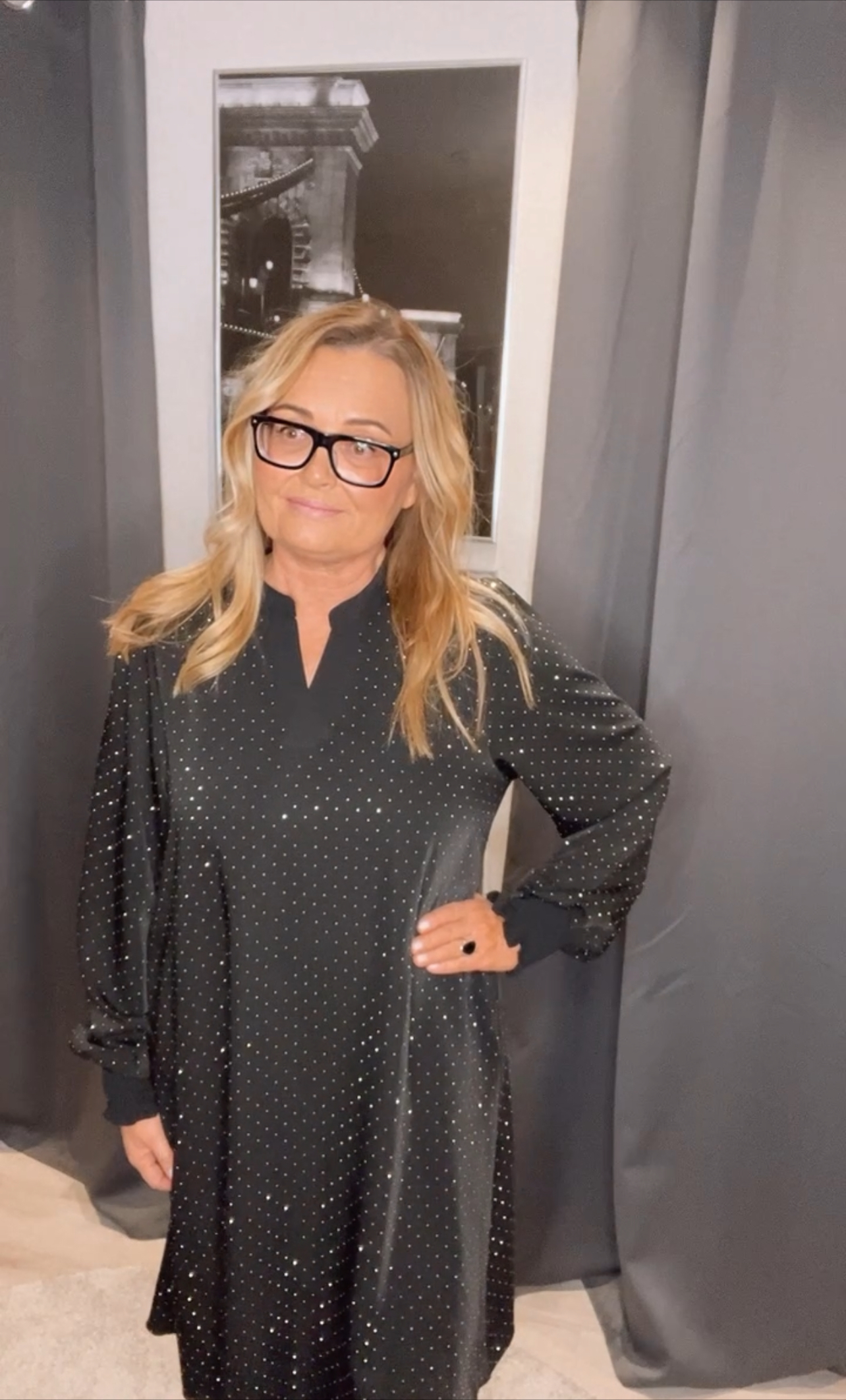 Betty klänning med stenar, härligt glittrig klänning med påklistrade stenar. Fin A-linje knälång modell med v-hals och smock på ärmen. Fint även med en byxa till denna klänningen.