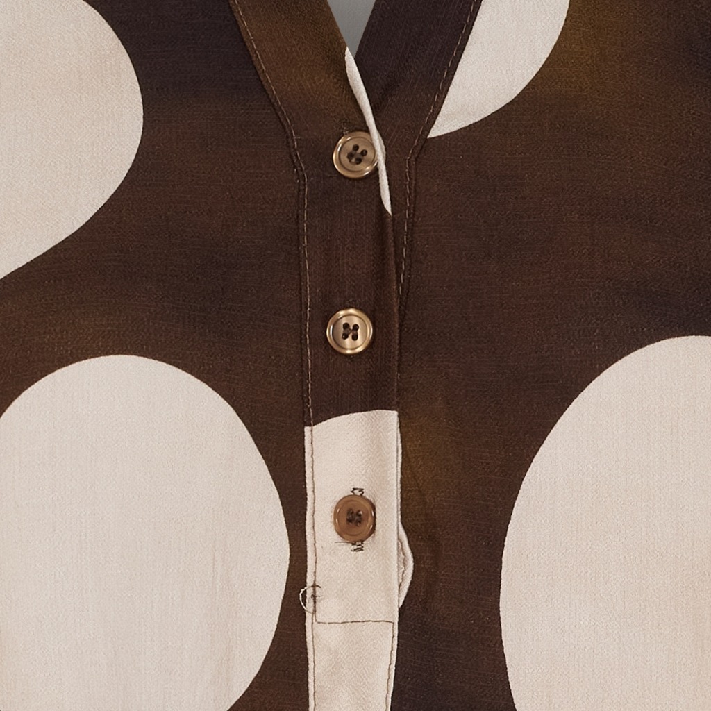 Cypress klänning, Brun. Skön klänning i viscose. Lite nättare modell. Ståkrage, knappar i ringningen, trekvartsärm med en volang på ärmslutet. Väldigt användbar klänning, du kan bära den även som tunika över en vaxad byxa.