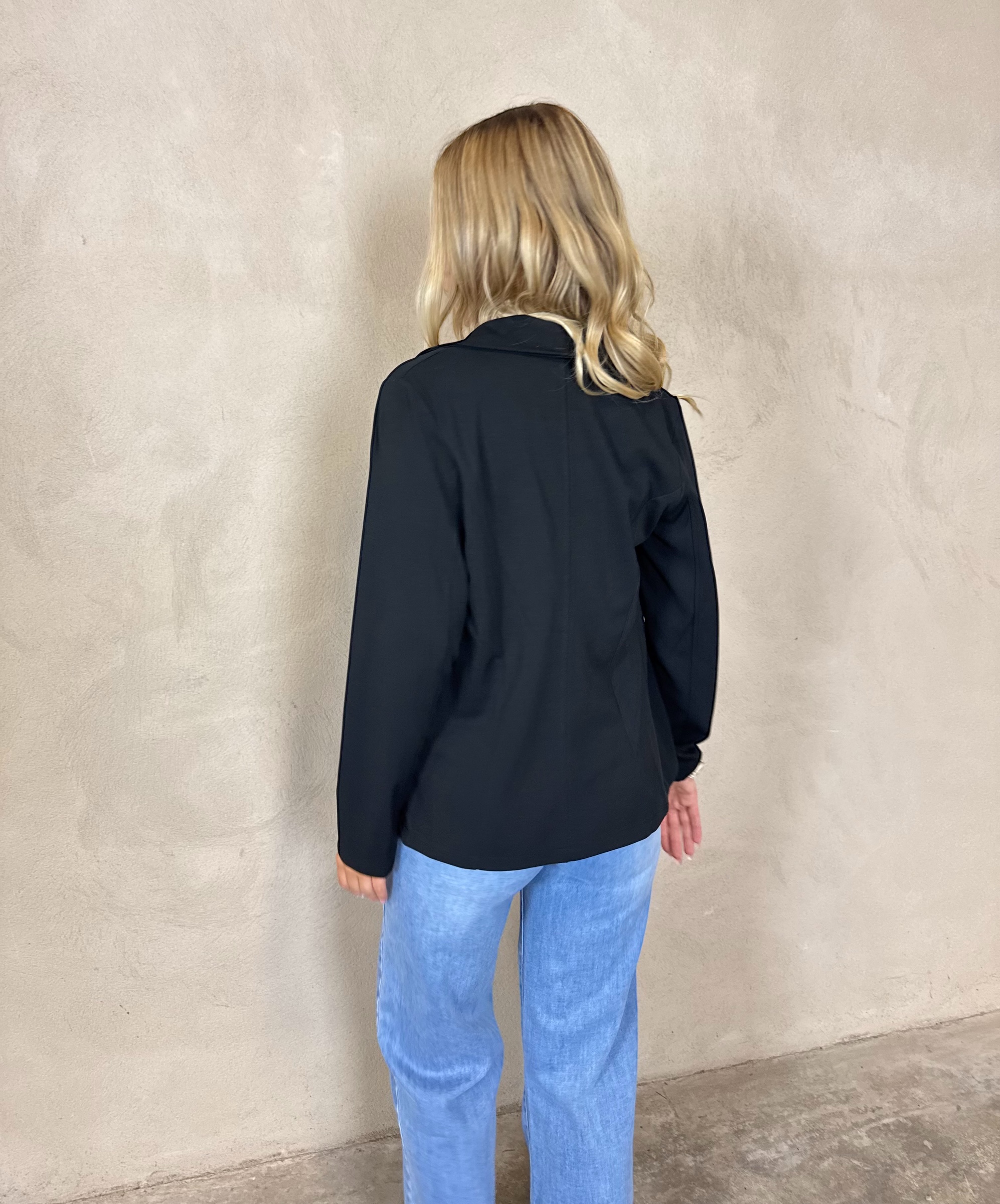 Petit kavaj, tillhör Petit kostymbyxa. En svart, figursydd Suuuperstretchig kavaj i samma följsamma och stretchiga material som vår populära Petit kostymbyxa – perfekt för både vardag och fest. Fungerar lika bra till jeans för en mer avslappnad look. Ett mångsidigt plagg med hög komfort som snabbt blir en ny garderobsfavorit. Här har modellen gått upp en storlek i kavajen, bär en M. Byxan har hon gått ner en storlek i och bär XS.