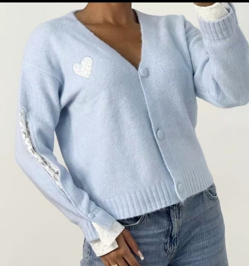 Simona kofta, Beige. Gullig och mysig kofta i ett supermjukt material. Klädda knappar i samma material som koftan, litet hjärta på framsidan, spets på underärmen samt i ärmavslutet runt handled. Härlig lite annorlunda kofta.