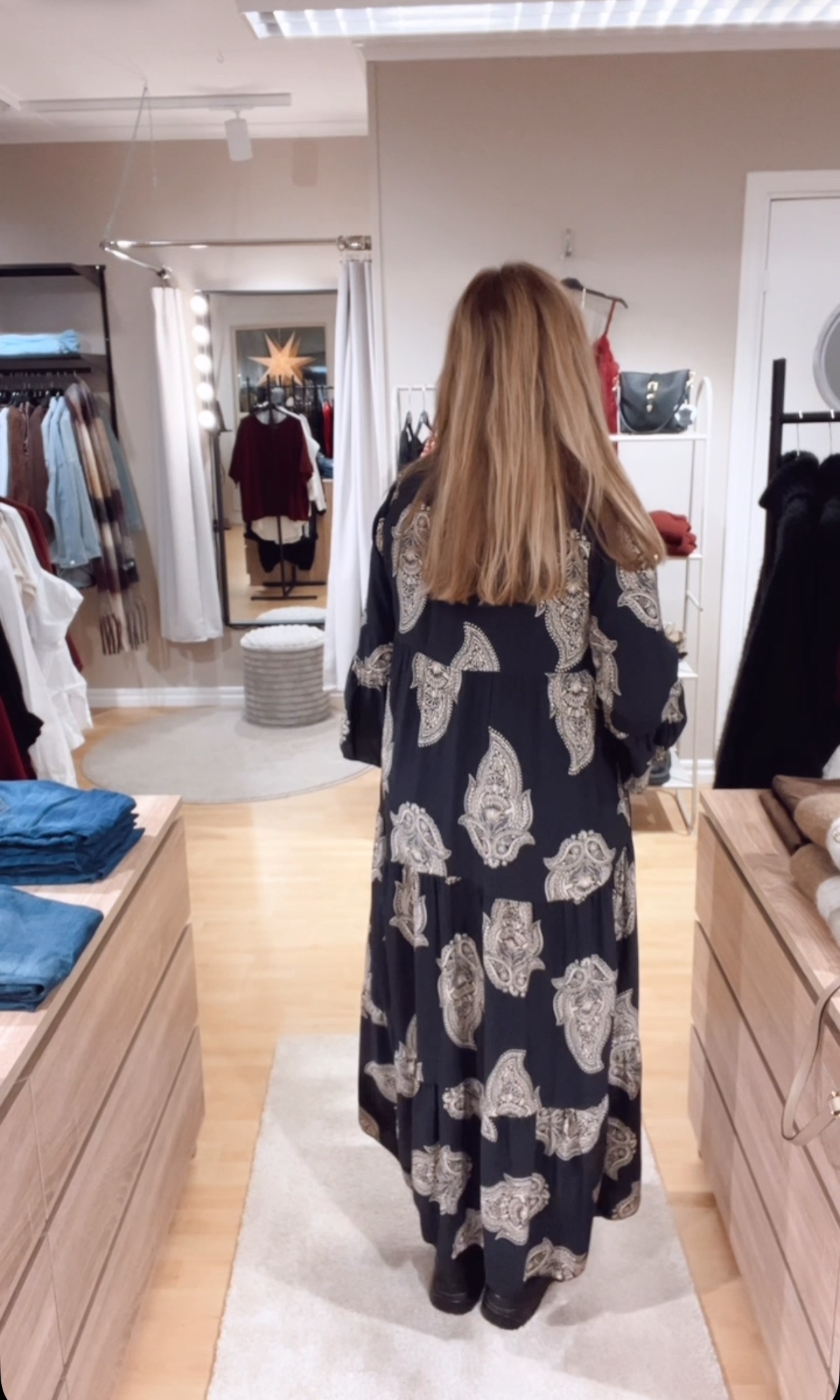 Zassi dress Paisley. Denna härliga viskosklänning i maxilängd har en elegant, mjuk fallande siluett. Klänningen är designad med trumpetärmar som ger ett luftigt och feminint intryck. Det lätta tyget andas och rör sig fritt med kroppen, vilket gör den till den perfekta klänningen. En sofistikerad och samtidigt bekväm klänning som passar både till vardags och fest. Snyggt med sneakers till, och Coolt även med grova kängor.